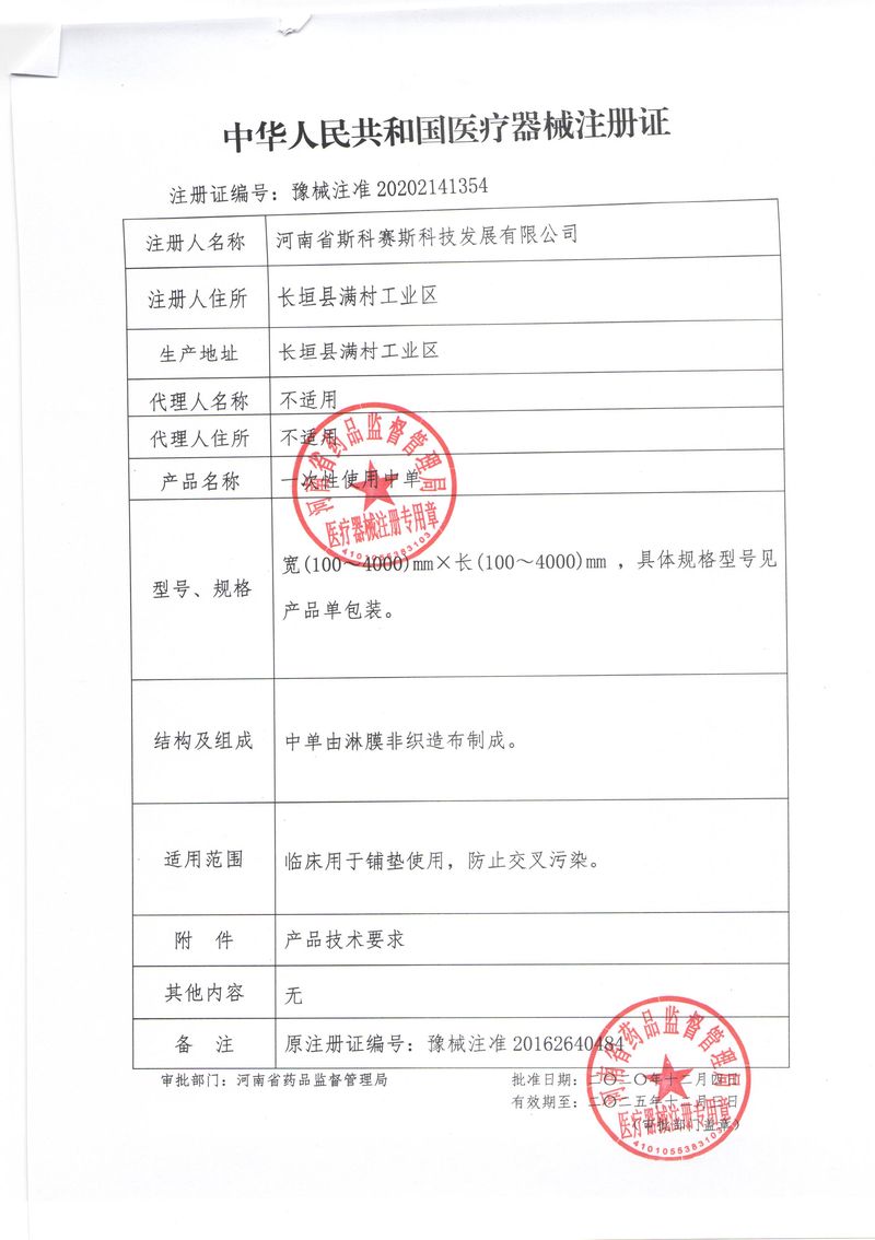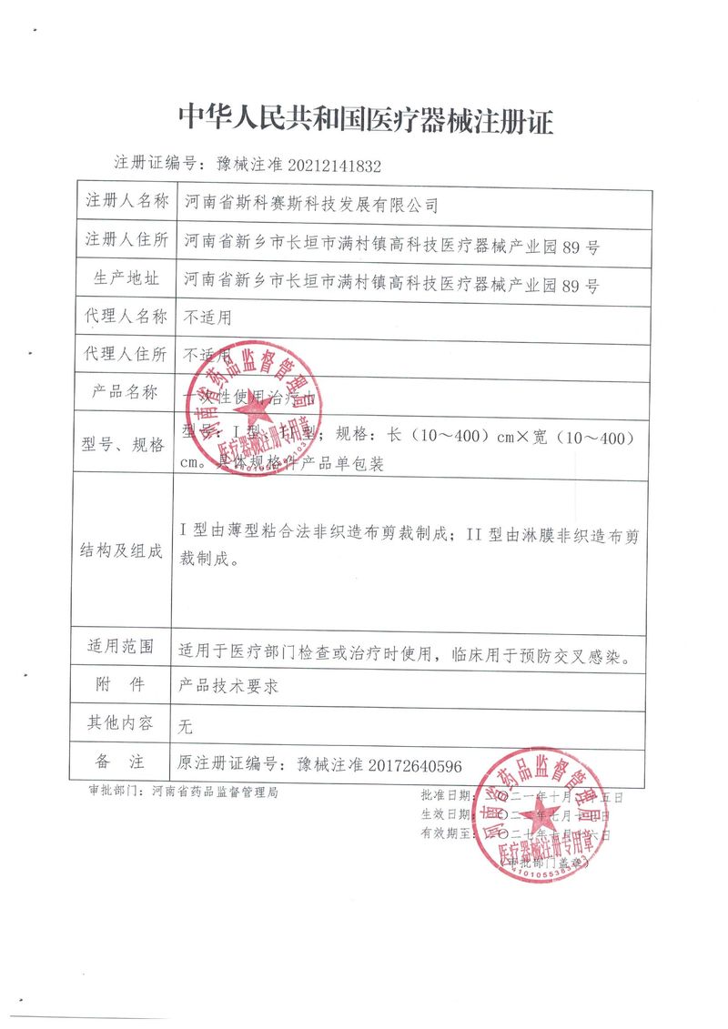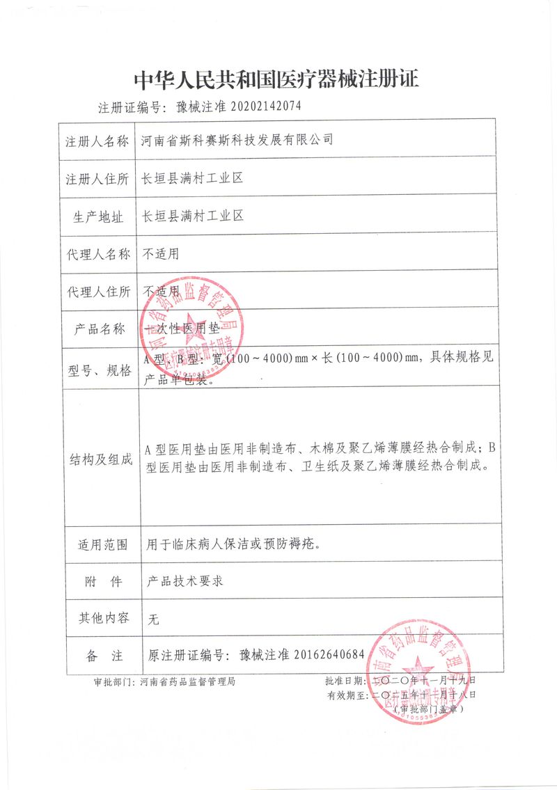 河南省斯科賽斯科技發展有限公司創建于 2011 年,位于“中國醫療耗材之都”- 河南省長垣縣,西臨 308 省道,南靠新菏鐵路,北依長濟高速,交通便捷,經濟發達,環境優美。斯科賽斯積極進入醫療健康和服務領域,秉承為用戶創造價值的理念,專注于醫用耗材解決方案的研發和運營,并為用戶提供完善的產品解決方案;  斯科賽斯主要生產醫用麻醉系列、醫用高分子系列、醫用敷料包系列、醫用無紡布系列、醫用防護系列、醫用脫脂棉系列、生物材料制品類等七大類、100 多個品種、400 多個規格的產品。公司占地面積約 30000 平方米,建筑面積20000 平方米,擁有 10 萬級的凈化車間總面積 10000 平方米。擁有國際先進水平的生產設備和檢測儀器,技術裝備精良,檢測手段完善,為醫療行業的不斷發展進步提供保障。公司順利通過 ISO9001、ISO13485 質量管理體系認證。  斯科賽斯堅持研發高科技新產品,力爭在醫療器械關鍵領域取得技術和研發的重大突破;立足國內和國際兩個市場,逐步實現管理理念、經營機制、人力資源、技術、產品、市場等全方位對接,提高企業的核心競爭力;過去的歲月里,斯科賽斯砥礪前行,誠信務實,銳意進取,不斷創新,用自己的睿智和辛勞,以富有責任感的使命,在探索中追求,在追求中超越,致力于成為值得信賴的醫療用品生產企業!在未來的日子里,斯科賽斯將一如既往豪情滿懷,信心百倍,攜手并肩,執著追求,向更高的的目標前進,鑄造新的輝煌!
